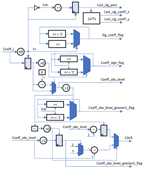 Figure 7 shows the proposed hardware implementation of the architecture in Figure 6 for residual SE generation. In this architecture, the last significant position of the coefficient group is determined firstly for Last_sig_coeff_x, Last_sig_coeff_y SE generations and becomes the entry point for the next scans. From this position, each coefficient is evaluated to generate significant, sign, greater-than-one, and greater-than-two flags that are complied with the HEVC standard. For significant flagged-SEs, each coefficient is evaluated whether equal to zero to add a ‘1’ or ‘0’ flag to its flag vector. For each non-zero coefficient, a comparison with zero to determine whether it is positive or negative one to add a ‘0’ or ‘1’ flag to sign flag vector. This sign flag is also used to calculate the absolute value of the coefficient, which will be used to determine the greater-than-one and greater-than-two flagged-SEs as well.