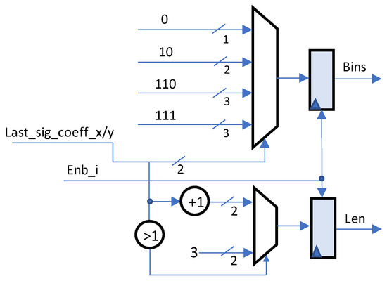 Generated SEs for 4 × 4 TB or 4 × 4 sub-block of residual coefficients from SE generation module are sent to the binarization core. Based on each SE type, it will invoke an appropriate binarization process to generate bin string. All flagged-SEs are encoded with Fixed Length process and CALR SEs are encoded by CALR process. Whereas X and Y coordinates of the last significant coefficient position are undergone truncated rice binary processes. Normally, they are simultaneously binarized by two separate truncated rice modules. Hardware implementation of this module for X and Y coordinates is shown in Figure 8.