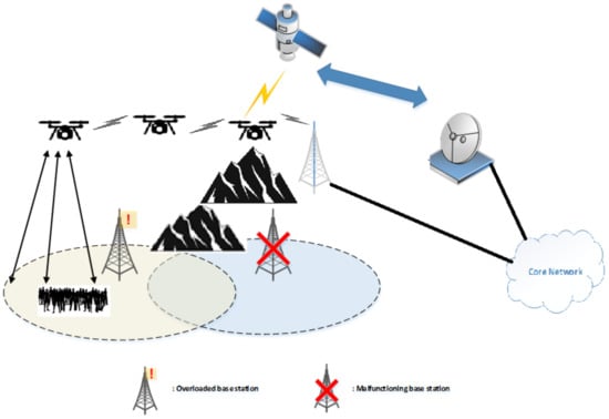 The coverage area supported by an UAV-mounted BS is a function of many parameters [1,39,40,41], such as, the type of RAN, the transmission power (depending on large- and small-scale fading of the channel), the antenna characteristics, the environment, the user density, and the UAV characteristics (i.e., flying altitude, battery lifetime, hovering time duration, storage size, and processing capabilities). In particular, multi-tier U-RANs serving the same area by several cells of different sizes can be employed to accommodate large traffic volumes while keeping high quality of service (QoS) and good coverage [10,42,43].