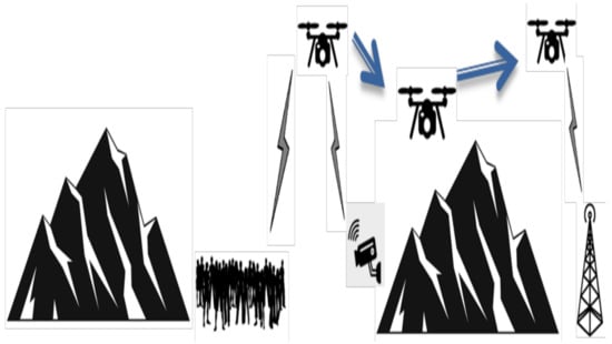 Relaying is a way to improve transmission reliability over fading channels, by opportunistically taking advantage of the broadcast nature of wireless communications [47]. Due to practical constraints, i.e., limited mobility and wired backhauls, many relays in terrestrial RANs are placed in fixed locations, thus providing only static relaying functionalities. Using UAVs as relays (see Figure 2) introduces additional degrees of freedom: for instance, UAVs can move between a source–destination pair, by uploading data from the source and, then, downloading it to the destination (so-called data ferrying) [38].