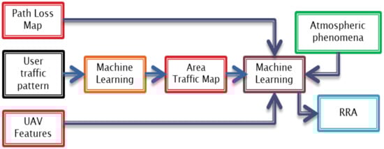 Radio resource allocation (RRA) in U-RANs includes functionalities such as power control, spectrum management, beamforming design, backhaul management, cache management, and computational resource management. Such tasks can be jointly managed by resorting to ML tools, as depicted in Figure 5. Different variables of user patterns and behavior, such as spatial positions and communication requirements (e.g., their need of the data traffic rate, their delay tolerance, and reliability), can be considered as main user patterns that can be injected into the ML box. User pattern data can be gathered in an offline manner or can be predicted at a specific time during the day. RL techniques can be used to single out the best A2G connections that minimize interference, whereas SL approaches are more suitable for dynamic bandwidth assignments. The number of far-flung connections should be accurately controlled to mitigate interference. The optimum number of connections can be also achieved in a learning process using RL. State is the number of links at a certain time, action consists of adding or removing the certain number of UAV-based radio links. When there is no dataset available, RL can also be used to generate input data for the SL approach. Hidden information in user traffic pattern and priority of some users over the others can be extracted from data via ML techniques in order to build an area traffic map. UAV features, such as flight time and speed, and characteristics of the RAN interface, can be used in combination with a path loss map and specific information of weather conditions [11,34,40,55,65].