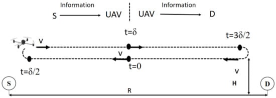 UAVs can be used as collectors and relays in IoT applications [66,67]. With reference to Figure 6, the UAV starts its journey towards the source (S) at time with speed v, to collect its data at (first phase or hop). In the second phase or hop, which starts at , the UAV flies to the destination (D) and sends the data in its buffer to D at . It is obvious that, compared to static relaying with fixed relays at a given position, such a mobile relaying strategy allows one to shorten the link distance in each of the two hops.