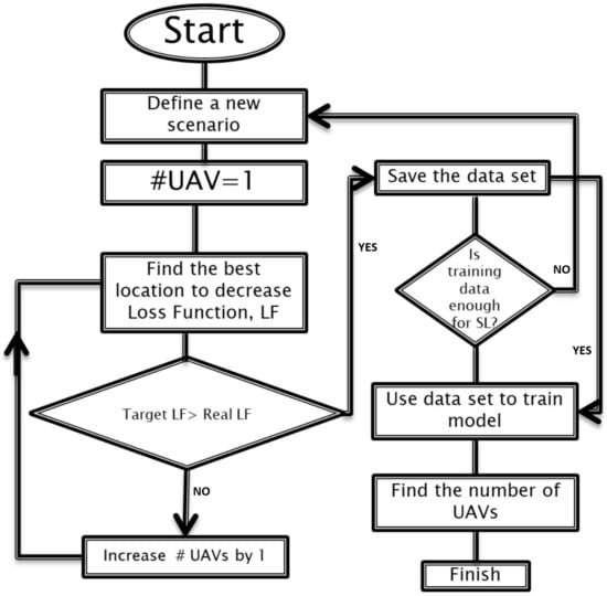The percentage of failure in downloading the file by the users is another loss function, reward and punishment, in which adding or decreasing one UAV can be considered as an action and the number of UAVs is instead the state. The flowchart of this process is reported in Figure 9. As a first step, a certain number of the scenarios is defined and the number of UAVs is obtained by using RL with defined loss function. The results are stored as the input dataset and desired outputs. Then, a certain number of scenarios is redefined, and the output is generated by using SL in the next phase and for these scenarios the loss functions are checked. If a certain percentage of failure in the desired results is observed, then more datasets should be generated in order to be injected into the SL box. Thus, data are achieved by RL method and the results are stored until the desired value in the second phase is achieved. A number of additional scenarios can be defined as a certain percentage of the scenarios that was used at the first step in the RL phase.