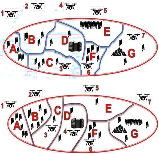 Traditionally, the locations of terrestrial BSs are mainly calculated on the basis of the user density and traffic requirements. When UAVs are used as BSs, their 3D positioning is a critical issue. Figure 10 shows a scenario in which different users are served by multiple UAVs. Specifically, the upper-side plot in Figure 10 shows a scenario in which different users are served by seven UAVs (UAVs support areas A, B, C, and so forth). Each UAV is associated with an area delimited by curves. The boundaries of such areas are changed as user traffic varies and, accordingly, the location of the UAV is updated, as in the lower-side plot of Figure 10. The partition is developed so as to maximize the coverage area as well as to minimize the flying time of the UAVs and their communication power expenditure.