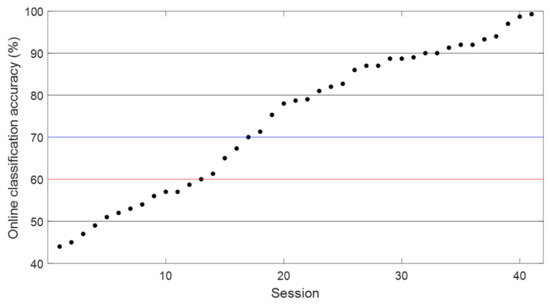 Distribution of classification accuracy for 41 online MI-BCI sessions in increasing order. Sessions above the blue line (classification accuracy ≥ 70%) and sessions below the red line (classification accuracy < 60%) were categorized as the high- and low-performance groups, respectively.
