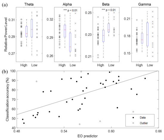 Eyes-open resting state: (a) The RPL distributions of theta, alpha, beta, and gamma powers between the high- and low-performance groups. (b) Regression analysis between the EO predictor with three frequency bands (theta, alpha, and beta) and online BCI classification accuracy.