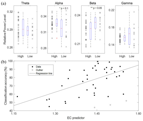 Eyes-closed resting state: (a) The relative power level (RPL) distributions of theta, alpha, beta, and gamma powers between the high- and low-performance groups. (b) Regression analysis between the EC predictor with two frequency bands (alpha and beta) and online BCI classification accuracy.