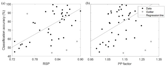 We note that this proposed RSP considered the alpha and beta powers of both resting states and the theta band of the eyes-open state. We conducted a regression analysis between the RSP value and online BCI classification accuracy with this RSP, and found that the RSP and online BCI performance were correlated strongly (r = 0.71, p < ), as Figure 4a shows. A permutation test with 5000 iterations was conducted to test whether the correlation was significant, and it was found to be quite significant for our proposed predictor (p < ). For comparison, we computed the PP factors in Ahn et al. [23] with those in our dataset, which yielded a correlation with BCI classification accuracy of r = 0.48 (p < ), as presented in Figure 4b. This correlation between the PP factors and online BCI performance was significant (p < from the permutation test), but lower than that reported in Ahn et al.’s study (r = 0.59) [23]. This result suggests that the PP factors may depend on the dataset because of variability in a single state.