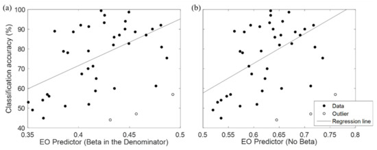 (a) Regression analysis between the modified PP factor (Case 2, beta power in the denominator) and online BCI classification accuracy, and (b) Regression analysis between the modified PP factor (Case 3, no beta power) and online BCI classification accuracy. Outliers (90% confidence interval) are shown as blank markers.