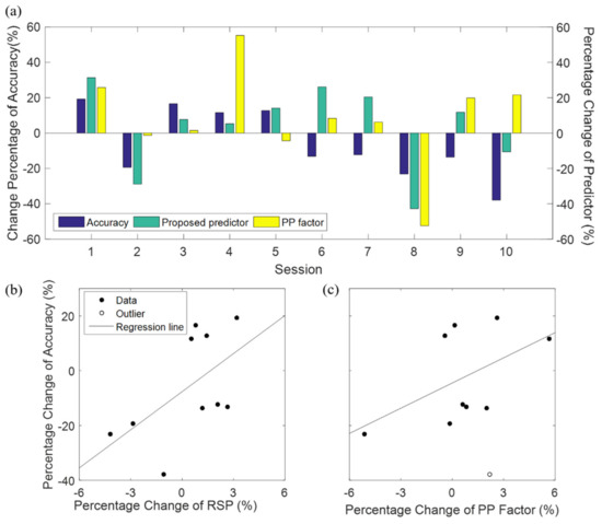 First, we excluded from this analysis certain subjects (sessions) with either a small change ), or abnormally larger changes in classification accuracy ). After reasonable sessions were selected, we analyzed the session reliability in 10 data sessions. Figure 6a presents the comparisons between the percentage change in online BCI classification accuracy and percentage change in the two predictors (RSP and PP factors). A regression analysis was performed for each predictor, as shown in Figure 6b,c. The RSP in our proposed predictors yielded quite a high positive correlation (r = 0.56, p < 0.1), although it appears less significant because of the small dataset. In contrast, the PP factor’s correlation was slightly less after one outlier at the 90% confidence interval was excluded (r = 0.52, p > 0.1). From this observation, we believe that the RSP may be relatively more robust to session variability than the PP factor.