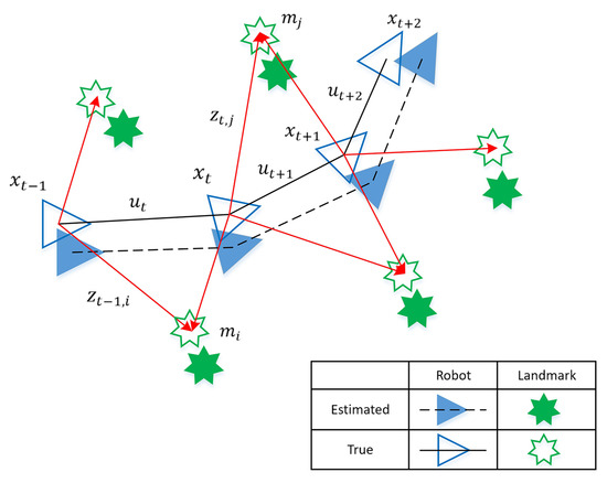 SLAM is the process by which the robot draws the environment map and estimates its position [1]. A schematic diagram of this approach is shown in Figure 1. The mobile robot uses LIDAR to observe unknown landmarks by moving within the environment. The variables described below are defined at time t: