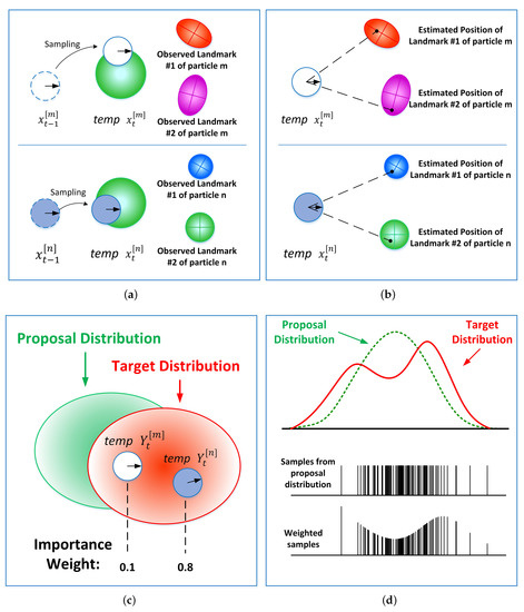 - Importance weight.The importance weight for the ith particle represents the proportion between the target distribution and the proposal distribution mentioned above. It is defined as follows: