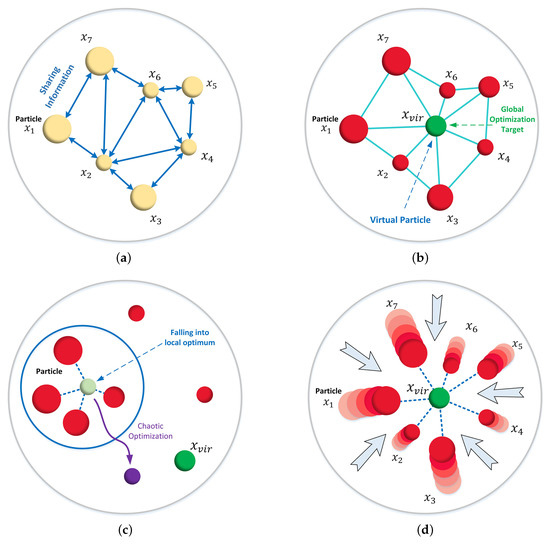 Particle update process of FCPSO. (a) Information sharing between particles. (b) Define the virtual particle to get the global optimisation goal. (c) Deal with particle premature convergence using chaotic optimisation. (d) Particles move toward global optimisation target.