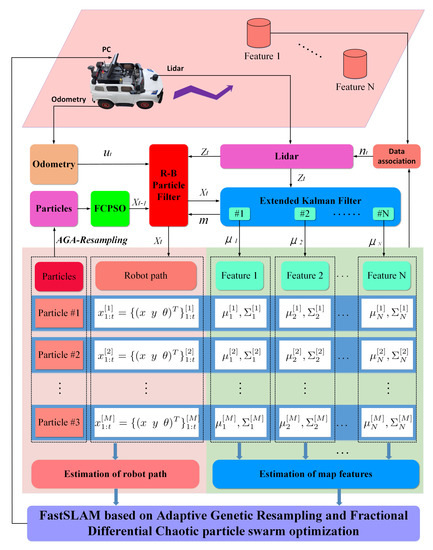 We use the FCPSO algorithm to optimise the FastSLAM algorithm. First, we use the particle filter based on AGA-Resampling to resample the possible robot position. We then define the virtual particle and use it as the optimisation target of FCPSO, which attracts particles to move to the actual position of the robot. The proposed method, which uses FastSLAM based on AGA-Resampling and is further optimised by FCPSO, is called IFastSLAM. This approach is different from the standard FastSLAM scheme because it uses an additional process to compensate for particle degeneracy. This compensation process serves as a key strategy. The overall scheme of the algorithm is shown in Figure 4, and pseudo-code is given in Algotithm 1.