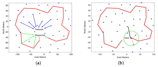 The simulation environment is illustrated in Figure 5a. It is in effect a search area of size 250 × 200 m. In this simulation experiment, 17 waypoints and 35 landmarks were randomly set. The red trajectory represents the designated simulation path, the red ‘o’ is the waypoint, and the blue asterisk is the stationary landmark. The robot starts from (0,0) and moves counterclockwise along the red trajectory shown in Figure 5a to obtain the estimated trajectory and the estimated landmark. Figure 5b shows a screenshot of the process of simulation at a certain moment. In Figure 5b, the black triangle represents the robot, and the green circle represents the observation range of the robot, which is centered on the robot. The robot can observe landmarks within a certain measuring angle inside the green circle. The estimated trajectory is represented by a black line, and the estimated landmark is denoted by a red asterisk.