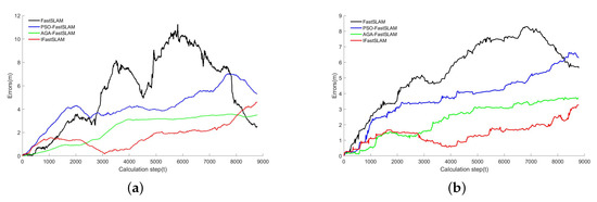 PSO [16] is a group algorithm that optimises a problem by iteratively updating the particle set using local and global optimal values. Global optimal solution can be obtained with high probability. It has been proved that the PSO algorithm can effectively improve positioning accuracy in the problem of positioning of mobile robots [17]. Tdor [18] introduced the PSO algorithm into SLAM for the first time, while Havangi [19] used PSO to optimise the proposal distribution. PSO makes the particles aggregate at locations with high posterior probability before the weights are updated, and the impoverishment of particles can be prevent. Ye [20] proposed a random weight PSO strategy to improve the FastSLAM algorithm, to avoid particle degeneracy and maintain particle diversity. Seung [21] proposed a relational FastSLAM approach that integrated the PSO algorithm into the calculation of the weights and formation of the particles. Zuo [22] proposed a new FastSLAM method based on quantum-behaved PSO to improve the proposal distribution of particles and optimise the estimated particles. Due to the collaborative optimisation of PSO, the accuracy of SLAM was significantly improved. However, there still are some problems in with FastSLAM based on the PSO algorithm: The most typical of these is that the algorithm can easily fall into a local optimum, and another is the low calculation speed. To further enhance the algorithm, we propose an improved PSO algorithm FCPSO, in which the fractional differential is employed to speed up the evolution of the PSO algorithm and chaotic optimisation is utilised to address the problem of premature convergence.