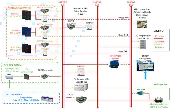 The conception of the microgrid is based on the production of energy entirely obtained from renewable resources, which guarantees the production and storage of energy with zero CO2 emissions. The microgrid includes different RES power generation systems on several kW scales, together with similar scale hydrogen and battery storage systems. The architecture integrates a mixed type, AC/DC electrical topology presenting a high-voltage DC bus (400 V DC) and a standard 1ph-230 V/3ph-400V AC bus, Figure 1 [].