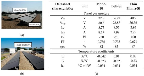 (a,b) Detail of the solar PV installation of microgrid shown in Figure 1; (c) PV panels datasheet characteristics.