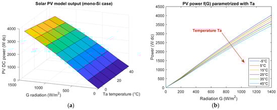 For each technology, the output power results as two independent variables function, represented in the case of monocrystalline silicon in Figure 3a. The parametrical temperature and radiation effect are shown in Figure 3b.