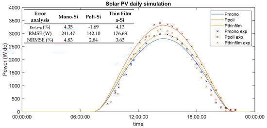To validate the proposed model with experimental data, Figure 4 shows the daily power production for the three technologies of Figure 2, by running a full-day simulation with the locally acquired meteorological data and the experimental measurements.