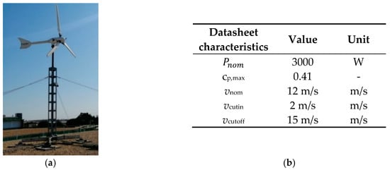 The 3-kW rated wind turbine will be modelled by implementing its power curve with a cubic curve as reported in the technical datasheet with a resolution of 1 m/s, Equation (4). The characteristic values of cut-in and cut-off speeds determine the limits of operation of the wind turbine. The nominal wind speed determines the value from which the power output goes from a cubic function to a constant, thanks to the variable pitch regulation (which is not detailed in this paper) of the turbine blades []. In the model of equation (4), constant electrical, mechanical and aerodynamic efficiency factors are considered, equal to 85%, 90% and 90% respectively.