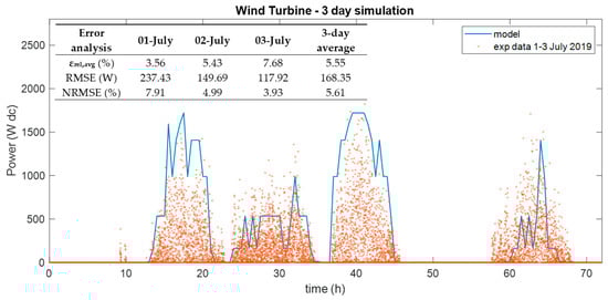 As can be seen in Figure 6, the power output obtained by the model (in blue) follows the trend of the experimental data (in orange) with a rather good approximation. The average relative error on a daily basis is below 8% (the worst case is 03/07) and on average throughout the three days below 6%. The average RMSE normalized respect to the nominal power of the wind turbine is also below 6%. It is assumed that, in the long-term annual simulations, the error is smoothened by the increasing amount of data.
