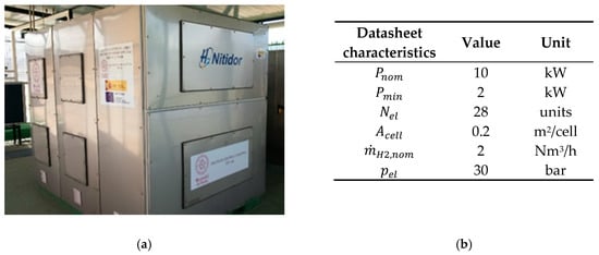 The microgrid is provided with a 10 kWe alkaline electrolyzer (Figure 7a) with datasheet characteristics shown in Figure 7b; the nominal production is 2 Nm3/h of hydrogen. The produced gas is stored, at the outlet pressure of the electrolyzer (30 bar), in a tank, Figure 7a.