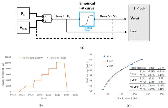 The empirical model scheme is reported in Figure 8a, interpolating the current and voltage data according to the empirical I-V curve obtained from experimental testing on the equipment. Due to the observed near-constant behavior of the voltage (from a system point of view), it is possible to derive a first iteration value of the current by simply dividing the input power setpoint by the nominal voltage. Once the first iteration current has been calculated, a second new value of voltage is calculated via a cubic spline interpolation on the empirical I-V curve. The iterative method continues, calculating a second iteration current and so on.