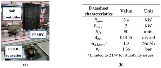 The PEM fuel cell that is part of the microgrid (Figure 9a) is made up of a stack with 80 single planar cells in series, with an active surface of 0.0145 m2/cell []. Its nominal power is 3.4 kWe, but due to stack degradation the actual power is limited by the control system to 2 kWe. Datasheet characteristics are reported in Figure 9b.