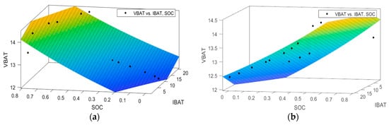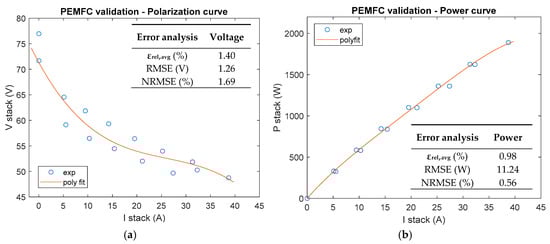 Empirical I-V curves were obtained by applying a third-order polynomial fit—Equation (6)—according to the cubic spline interpolation method with respect to experimental I-V measurements obtained by testing one fuel cell unit over a power setpoint range from 0 to 2 kW—Figure 10a. Since the fuel cell power is limited to 2 kWe [], the fuel cell output power can be considered linear with reasonable approximation, Equation (7) and Figure 10b, since the concentration loss region is not reached. By knowing the input power setpoint of the system, the operating current in the linear region can be determined from the I-P curve; successively, by entering the I-V curve with the found value of current, the voltage can be determined. The committed average relative error is below 2% with respect to the median of the experimental values, which are affected by hysteresis in the measured power setpoint range. The trend of the obtained curves shows correspondence with the literature-reported data [,].
