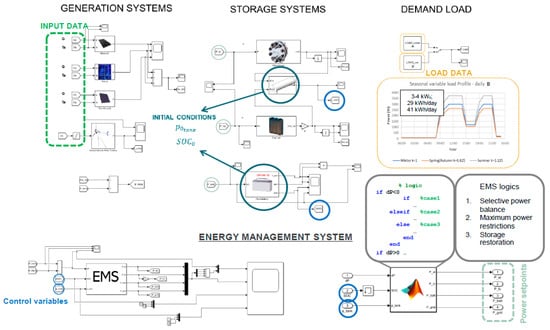 In general, the proposed component modelling approach is an intermediate step between system and process modelling; in fact, the objective is to obtain an easily customizable model to assess energy dispatch strategies over yearly simulations in an hourly timestep, without considering transients and local controllers that operate on the order of seconds. It is supposed that each component will be equipped with an internal control loop that ensures the component operates in a suitable way (Maximum Power Point Tracking MPPT algorithms for solar PV, blade pitch control and par regulation for wind turbines, charge controllers for batteries, etc.) [,,,].