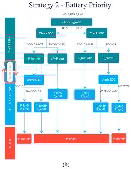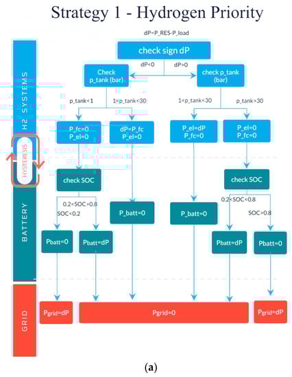 The control mechanisms described in the literature range from simple power balance strategies based on control variable monitoring (maintaining each component in its suitable operation condition range) [,,,], up to complex control strategies such as load management based on baseload and peak load [] hierarchical control (master-slave) [,], model predictive control [,], global optimization via objective functions [], self-optimization strategies [] and fuzzy logic [,,] and genetic algorithms []. Hydrogen-priority strategy in small scale hybrid microgrids with a hydrogen battery storage system is quite uncommon in scientific literature, except for few studies with combined solutions [,,] or hydrogen-only storage systems []. Battery-priority strategies are the typical high-level control systems implemented for short/medium-term microgrid management found in the literature [,,,,,]. A comprehensive review of different microgrid management systems can be found in [].