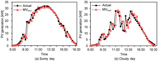MVhour model forecast; (a) PV forecasting on a sunny day; (b) PV forecasting on a cloudy day.