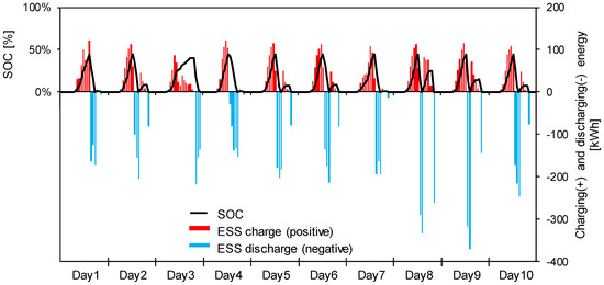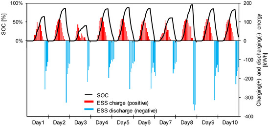 Based on mode 2, the ESS is scheduled to charge the designated amount of PV generation and discharge the same amount to the load as shown in Figure 3. When the ESS reaches the SOC, 0%, the ESS operates to charge again until PV generation ends. The daily peak of the SOC is the same during testing periods and the ESS operates two cycles per day except day 3 when is not charged to the SOC, 0.45.
