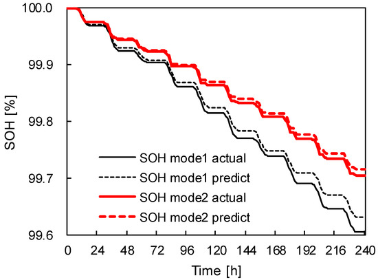 Starting with the ESS scheduling operation based on PV generation forecasting, capacity loss estimation using its hourly SOC data from the charging cycle is performed to evaluate the battery’s SOH. During whole testing periods, the results of battery degradation based on the ESS operation modes are compared to the result from the actual value of PV generation as shown in Figure 4. The battery degradation from the predicted ESS cycle in mode 1 is 0.37% and the SOH is 99.6% and the battery degradation in mode 2 is 0.29% and the SOH is 99.7%. In mode 2, the result of the SOH is 0.1% higher than mode 1 which indicates that the ESS operation with low DOD results in the less battery degradation than the result with high DOD. As can be seen, the difference of the SOH between battery degradation based on the actual value of PV generation and the predicted value is approximately 0.02% which is owing to the high accuracy of the PV forecasting model.
