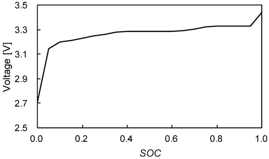 In general, the aging of the LFP battery indicates that the main factor of the battery degradation is the high SOC occurred by the charging process, which is due to the electrochemical charge overpotential when the SEI layer becomes large in high SOC region [49]. In the battery degradation model, the SOC coefficients (α and β) are reflected as shown in (7), which is changed at the SOC, 0.45. These coefficients are defined as the SOC dependence, which is determined from the curve fitting of experimental data [30]. The reason of the change can be identified through the SOC-open circuit voltage (OCV) relationship of the LFP battery as shown in Figure 5. The OCV is sharply changed in the low and high SOC region (0.9 and 0.05) and the other region is relatively flat because the SEI formation is varied little [49].