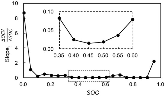 However, from only the SOC-OCV curve, the optimal threshold is hard to be determined for reflecting the SOC dependency. When the SOC-OCV relation is transformed to slope value as shown in Figure 6, the minimum value is at the SOC, 0.45. From this result, the coefficients (α and β) can be separately applied based on the SOC region and the optimal operation region of the battery is regulated under the SOC, 0.45 for the prolonged battery life.