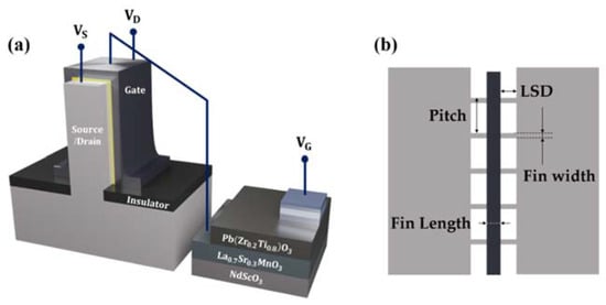 In this work, n-type enhancement mode FinFET is utilized as a baseline FET. The schematics of the Fe-FinFET are illustrated in Figure 1. The baseline FinFET has 80 nm, 30 nm, 40 nm, 5, 200 nm, and 1.4 nm channel length, fin width, fin height, number of fins, fin pitch, and equivalent oxide thickness, respectively. The fabrication process of the PZT ferroelectric capacitor used in this work is as follows: (i) a NdScO3 substrate was prepared and (ii) a 20 nm-thick La0.7Sr0.3MnO3 was deposited as the bottom electrode. Subsequently, (iii) a 60nm-thick Pb(Zr0.2Ti0.8)O3 (PZT) ferroelectric film was deposited using a pulsed laser deposition technique. Lastly, (iv) 60 nm-thick Au/Ti/Au top electrodes were deposited and patterned. The flow of the aforementioned fabrication process is illustrated in Figure 2b. The Fe-FinFET was implemented by physically linking the PZT-based ferroelectric capacitor to the gate region of baseline FinFET with gold wire. Each measurement was done using the Keithley 4200A-SCS semiconductor parameter analyzer at 300 K. For the input transfer curve measurement, forward and backward gate voltage sweep are done in sequence.