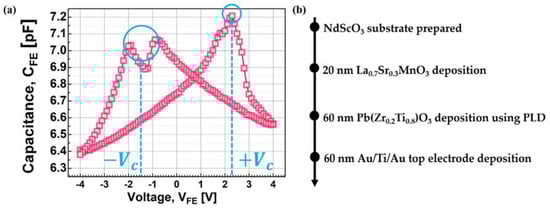 (a) Measured capacitance versus voltage of a ferroelectric capacitor. The blue-colored dash lines indicate the approximate positive coercive voltage (i.e., ~ + 2.25 V) and negative coercive voltage (i.e., ~ −1.5 V). (b) Fabrication process flow of a PZT capacitor.
