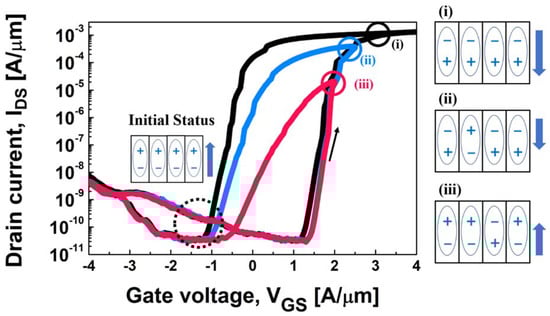 The ferroelectric layer with a single domain has only two polarization states (i.e., upward or downward direction). When a voltage higher than the coercive voltage is applied, a polarization state can be inverted to the other state. However, most of practical ferroelectric layers have a multi-domain structure [30]. Each domain in the ferroelectric layer has its own coercive voltage because it has more or less doping concentration and grain size than the other domains. As a result, an externally applied voltage can switch the polarization direction of only those domains which have a lower coercive voltage than the applied voltage [31,32,33,34,35]. This partial polarization switching can gradually change the conductivity of FeFETs for neuromorphic applications [36]. In order to investigate the partial polarization switching, we have fabricated a ferroelectric capacitor, and its measured capacitance (C)−voltage (V) is drawn in Figure 2a. The positive and negative coercive voltage of the ferroelectric capacitor are ~2.25 and ~−1.5 V, respectively. Compared with previous results which show one sharp peak [22], the two peaks at the negative coercive voltage would have originated from aging effect. Although it casts doubt on the ferroelectricity, this device still shows the properties of a ferroelectric layer [see Figure S1 in Supplementary Information]. Figure 3 illustrates the measured input transfer curves of FeFET for various VGS_positive with the same VGS_negative. For all cases [i.e., (i), (ii), and (iii)], the VGS_negative (which is higher than the negative coercive voltage of ferroelectric capacitor for the FeFET) is identical, so that the initial polarization state is identical (i.e., the initial state is aligned upward). As a result, the Vth_forward of the three cases are almost identical. In the case of (i), the VGS_positive induces complete polarization switching, and, thereby, all the domains in the ferroelectric layer are switched to the downward direction. This should result in the Vth_backward being lower than the Vth_forward. The reason for this observation comes from the fact that the downward polarization (in addition to the vertical electrical field from the gate electrode) contributes to the accumulation of electrons when forming a channel. However, in the case of (ii) and (iii), the VGS_positive is not high enough to switch every domain, which results in partial polarization switching (i.e., partially downward). Therefore, the Vth_backward for case (ii) and (iii) is higher than the value for case (i).