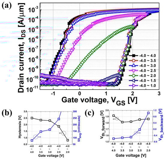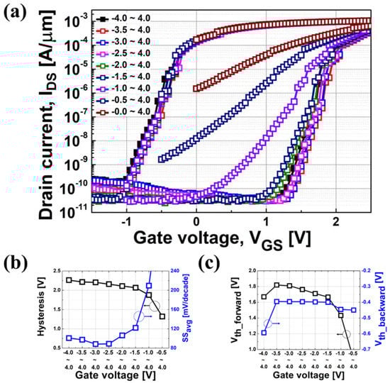 In the measurement, the gate-to-source voltage is applied to the device from VGS_negative to VGS_positive (i.e., forward sweep), then the gate-to-source voltage is applied to the device from VGS_positive to VGS_negative (i.e., backward sweep). In this work, the ranges of the gate voltage sweep are varied in two opposite ways: (1) VGS_positive decreases from 4 V to 1 V with the fixed VGS_negative of −4 V. (2) VGS_negative increases from −4 V to 0 V with the fixed VGS_positive of 4 V. Note that Vth_forward and Vth_backward were extracted using the constant current method at 1.375 × 10−7 A (i.e., 10−7 A × (2Hfin + Wfin)/Lfin). The hysteresis width was calculated by subtracting Vth_backward from Vth_forward.