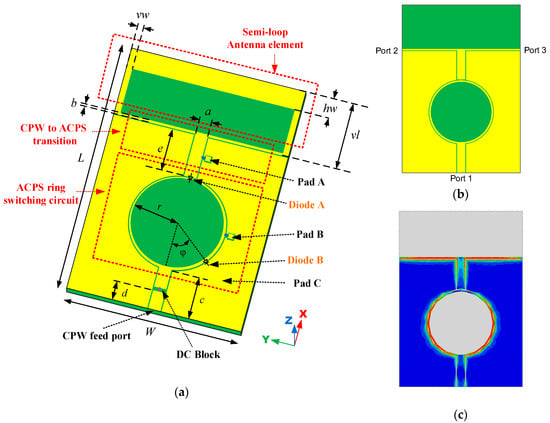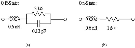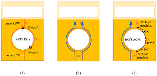 A CPW generally operates in the even mode. To switch antenna polarization, a circular ring made of an ACPS was fabricated for switching the CPW mode electrically. Figure 3a illustrates the geometry of the circular ring, which was made of a 100-Ω ACPS. There existed two diodes on this structure. The first diode (called diode A) was placed at the 12 o’clock position, which connected the ACPS ring and output CPW. The other diode (called diode B) was placed at approximately the 5 o’clock position, which connected the ACPS ring and ground plane. The diode used in this design was BAR64-02V, Figure 4 shows the equivalent circuit models of the diode when it was in the ON state and OFF state, which was employed in the simulation. Component values were chosen according to the datasheet []. As shown in Figure 1a, diode A was biased through Pad A and Pad B; diode B was biased through Pad B and Pad C (ground). Each pad had a series chip inductor of 22 nH to block RF signal passing through the bias line. When diode A was on (short circuited) and diode B was off (open circuited), the input power symmetrically passed through the left-hand side and right-hand side of the ACPS ring and then to the CPW output port through diode A. Therefore, as shown in Figure 3b, a normal even mode was produced on the output CPW. Since the characteristic impedance of the two current paths was 100 Ω, the resultant input impedance was 50 Ω. By contrast, when diode A was off (open circuited) and diode B was on (short circuited), the current only passes through the left-hand side of the ACPS ring and to the CPW output port by electromagnetic coupling. In this case, the odd mode was generated on the output CPW, as presented in Figure 3c. Since the electrical length of the current path was approximately half the wavelength at 2.45 GHz, the ACPS did not affect the input impedance. The circumference of the ACPS ring and position of diode B could be used to adjust the impedance matching of the feeding network when the network was used to excite the odd mode of the CPW. The relations among the bias voltage, diode states, and antenna polarizations are listed in Table 2.