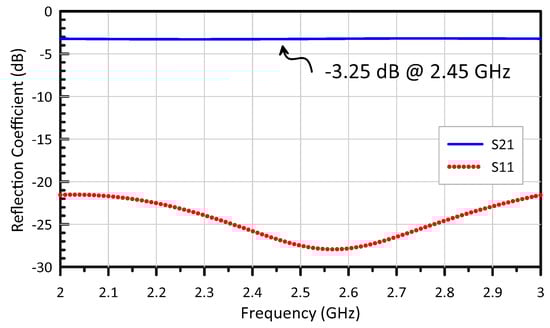 The simulated insertion loss displayed in Figure 2 indicates that the power input from port 1 was equally divided into ports 2 and 3, and only a 0.25 dB loss was observed. Two inverted L monopole antennas were installed on ports 2 and 3, where their open ends were connected together to form a rectangular loop structure. Since the bottom edge of the rectangular loop is not a part of the antenna, the structure is called a semiloop antenna.