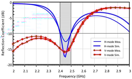 Figure 6 shows the fabricated prototype of the proposed antenna. As shown in the figure, Diode A was biased through the blue wire and the red wire, while Diode B was biased through the red wire and the yellow wire. The DC switch control voltage was obtained by a battery, which provided a large current of about 10 mA to ensure the AC resistance was low. The measured and simulated reflection coefficients of the proposed antenna are depicted in Figure 7. The red line represents the reflection coefficient when the antenna operated in the even mode (vertical polarization mode), whereas the blue line represents the simulation reflection coefficient when the antenna operated in the odd mode (horizontal polarization mode). The resonant frequencies of the two polarization modes were both approximately 2.45 GHz. The achieved −10 dB impedance bandwidths covering the two operation modes were 4.92% (121 MHz) for the vertical and horizontal polarized modes.