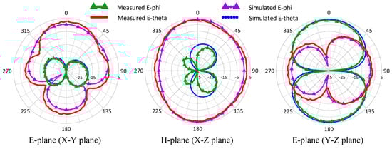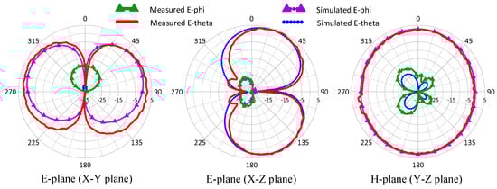 The fabricated prototype was also tested in an anechoic chamber. Figure 8 and Figure 9 present the measured and simulated radiation patterns when the antenna operates in vertical polarization mode and horizontal polarization mode, respectively. The measured antenna gain at +Z direction was approximately 2.62 dBi for vertical polarization, while it was approximately 3.37 dBi for horizontal polarization. The simulated radiation efficiency for vertical polarization and horizontal polarization were 84.9% and 78.2%, respectively, where the parasitic effects of the PIN diodes shown in Figure 4 was taken into account. The measured and simulated results were in good agreement, the experimental verification of the proposed design shown that good polarization purity was obtained. Table 3 gives a comparison between the proposed antenna and other polarization reconfigurable antennas. From this table, it can be seen that the proposed antenna provided both polarization and pattern diversities in a smaller size with a switching circuit included, and used less diodes. The reduction in antenna gain might be attributed to the small resonator size due to electromagnetic physics.