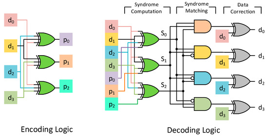 Encoding and decoding circuit of a (7, 4) Hamming code.