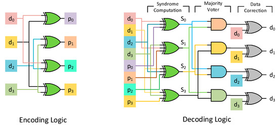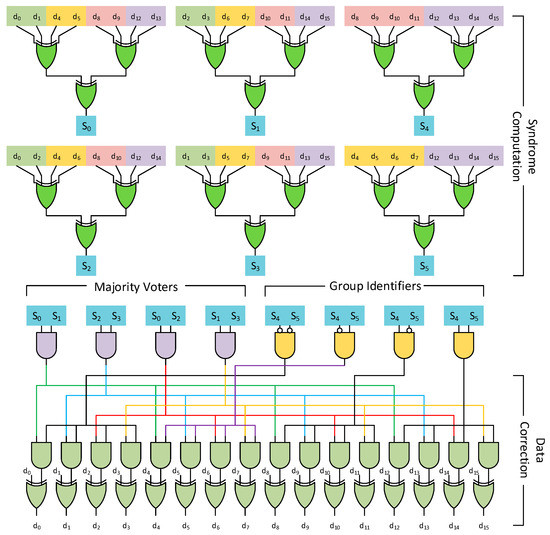 The above procedure leads to much lower redundancy due to the shared nature of parity bits. In comparison to a traditional OLS code, which would have had 16 majority voting circuits, i.e., one for each data bit, the proposed codes have 4 majority voters belonging to the base code, which are shared across groups. The disadvantage of such a method is that it increases the logic depth of the circuit, which leads to a slightly higher latency compared to traditional orthogonal Latin square codes.