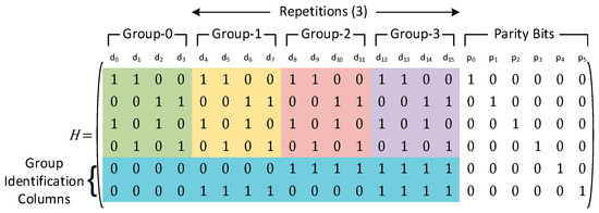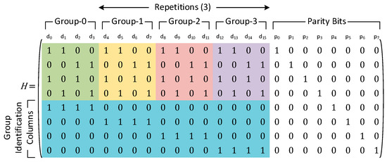 An example of a parity check matrix with number of data bits k = 4 and a repetition of three is shown in Figure 6. In this case, the different groups have been placed inside the differently colored boxes. The lower two rows (inside the blue box) are used to identify which group the error belongs to. The total number of data bits that can be protected using the above configuration is 16.