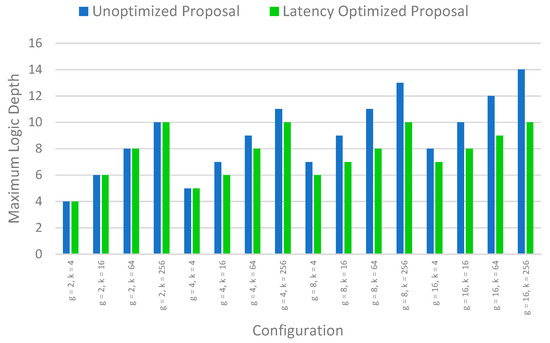 Assuming only 2-input gates and inverters integrated into the two inputs cases, i.e., inverters are not a separate depth, the total logic depth for the unoptimized case is given by Equation (10), while that for the latency optimized case is given by Equation (11). Figure 10 shows the logic depth comparison for the unoptimized case and latency optimized case for different values of base data bits k and different groups g.