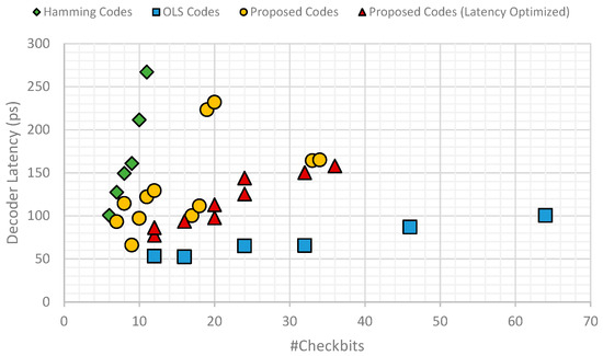 Figure 11 shows the comparison of memory overhead and decoder latency for the different codes across different numbers of data bits. As can be seen, Hamming codes provide the least memory overhead but that comes at the cost of high decoder latency. OLS codes instead have very low decoder latency but come at the expense of high memory overhead. The proposed codes, both the base version and the latency optimized version, provide a balanced trade-off between decoder latency and memory overhead.